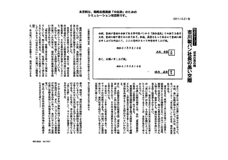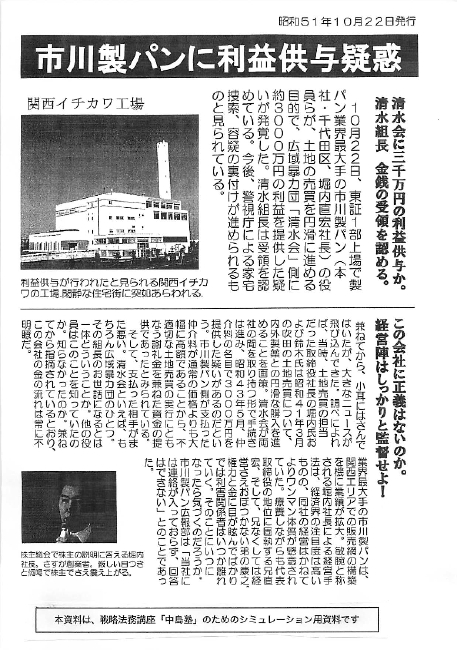 取締役の競業避止義務違反が裁判で争われた「山崎製パン事件」を母体にした、戦略法務講座中島塾で最も著名なケーススタディ。1期から今期21期まで全期において取り上げられているため、卒業生含めて全員が共通体験を有することとなり、中島塾受講者の一体感醸成に効果を発揮している。