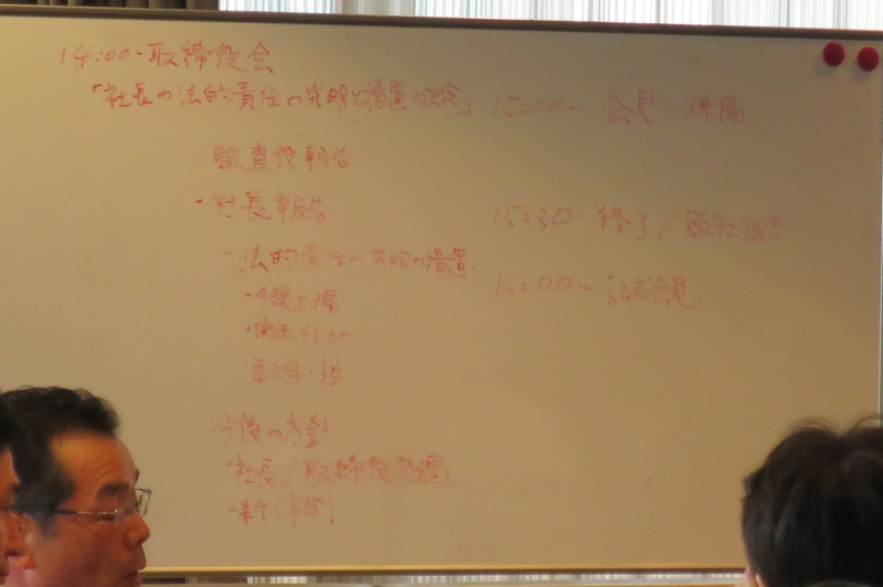 社長と副社長が並んで出席し、会社の一体感を演出しようとしたものの、「取締役会では何が話し合われたのか」「その端緒となった意見書を提出した監査役の話が聞きたい」「監査役を呼んでくれ」と記者は収まりがつかない。会社側は急遽東洋製粉出身の油井・伴野監査役を参加させるに至って、ますます収拾が付かず、不透明な印象を残して記者会見は終了。
