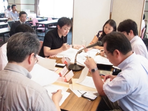 多摩川食品チーム13名の受講生には、それぞれ個別の役割・ミッションと情報が設定されているので、まずは与えられた個別の資料を読み込むことから始まる。自分自身の戦略目標と組織の戦略目標を設定しながら、それを達成するための戦術を検討していく。