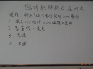 最後は「関西イチカワも千葉工場と同様に、会社に株式を移転する」ことで法的責任の究明は不明確なまま、鈴木社長の代表権と社長交代について決議が採択された。