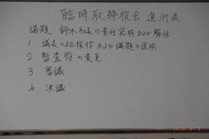 時代を昭和51年と仮定して、9月6日の予定で臨時取締役会を開催する。議題は社長の法的責任の究明と措置の決定である。ただし、法律は全て現行会社法など(平成26年7月現在)を適用するものとし、過去も同様の法律が施行されていたものと設定する。