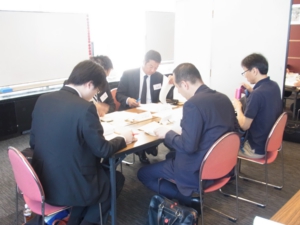 多摩川食品チーム9名の受講生には、それぞれ個別の役割・ミッションと情報が設定されているので、まずは与えられた個別の資料を読み込むことから始まる。自分自身の戦略目標と組織の戦略目標を設定しながら、それを達成するための戦術を検討していく。