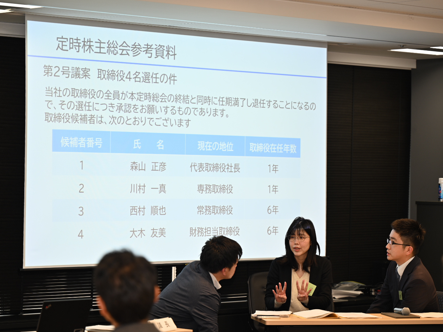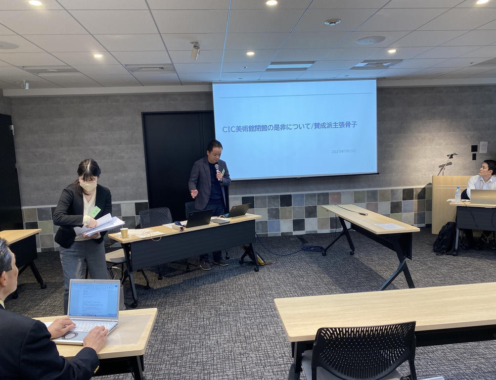「法務、広報、IR・SR 部、総務、経営企画」などすべての資質を備えた社内検討会メンバーとして、2 グループに分かれて「大村美術館を閉館すべきか、否か」についてディベートを行う。