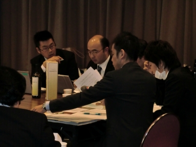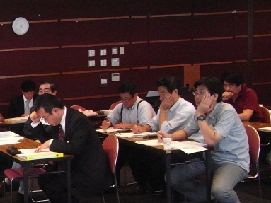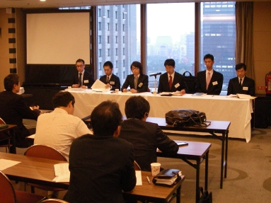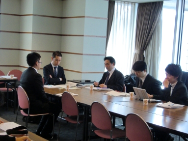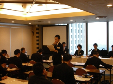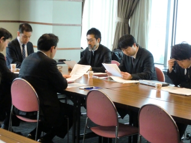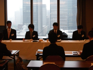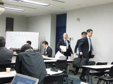 毎期最低1回は実施されるディベート形式による演習。現役受講生をテーマに対する「肯定派」「否定は」の2グループに分け、OB諸氏が審判団となり、論理性・説得力・資料の適切さ・反対尋問力、といった観点で勝敗を決する。